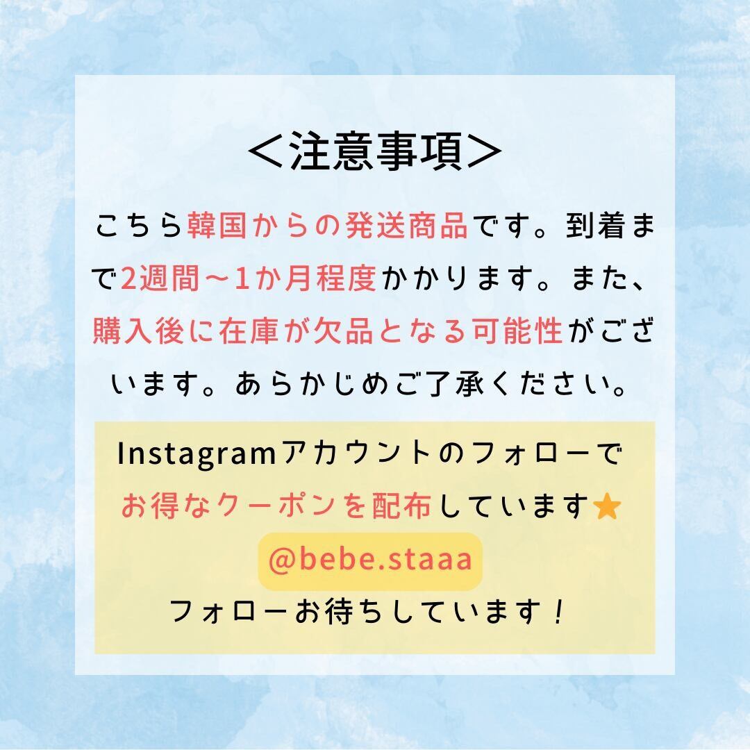 ・韓国と日本では検品基準が異なるため、縫製の粗さ(ボタン付けの甘さ、糸始末の不十分さ、縫製のずれ、タグの不備、プリント位置のずれ等)が見られる場合がございます。 ・生産工程上、事前の告知なく生地や仕様が変更となる場合がございます。 ・サイズ表記には、若干の個体差・誤差が生じる場合がございます。 ・当店では明らかな不良品を除いて検品を行っておりますが、縫製の個体差、ボタンの緩み、小さなインク飛び等は良品扱いとさせていただいております。 ・ご購入後のキャンセル・返品・交換は原則お受けできません。 ・商品のご購入から発送まで、最大で約2か月程度お時間をいただく場合がございます。 ・分納をご希望の場合は、ご購入時または事前にご連絡ください。