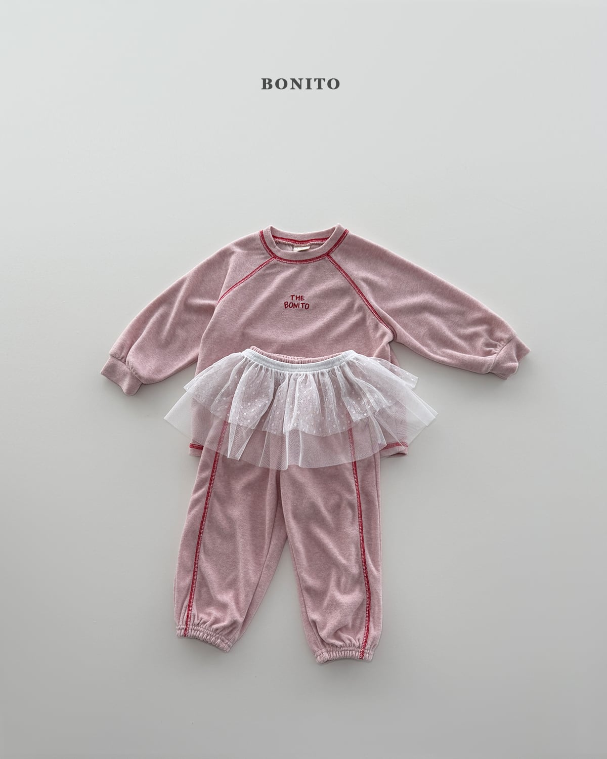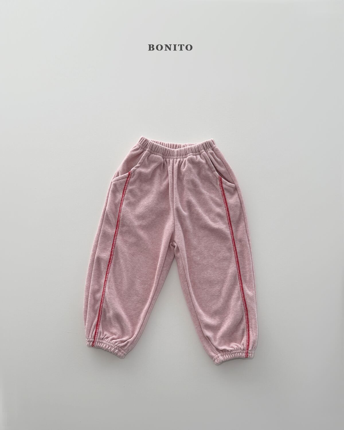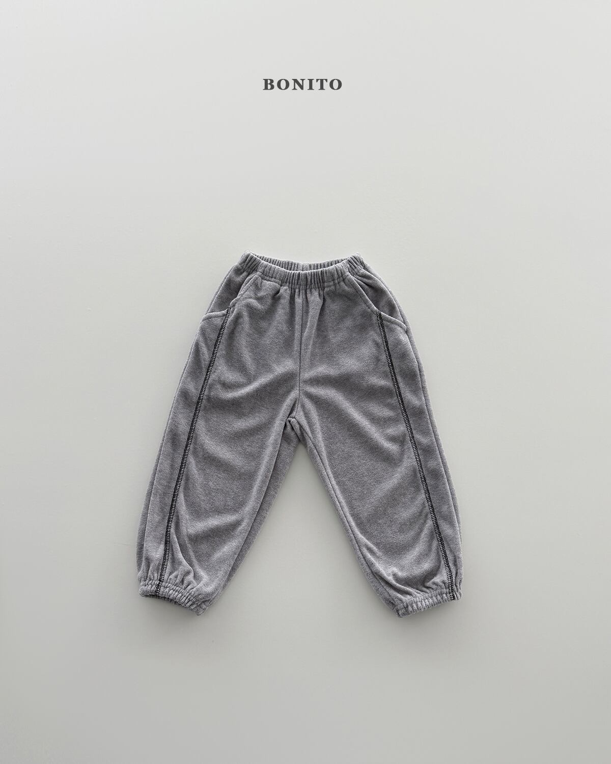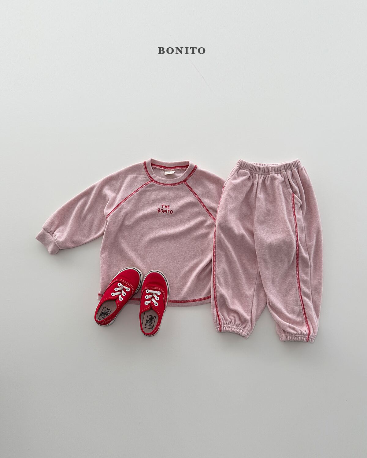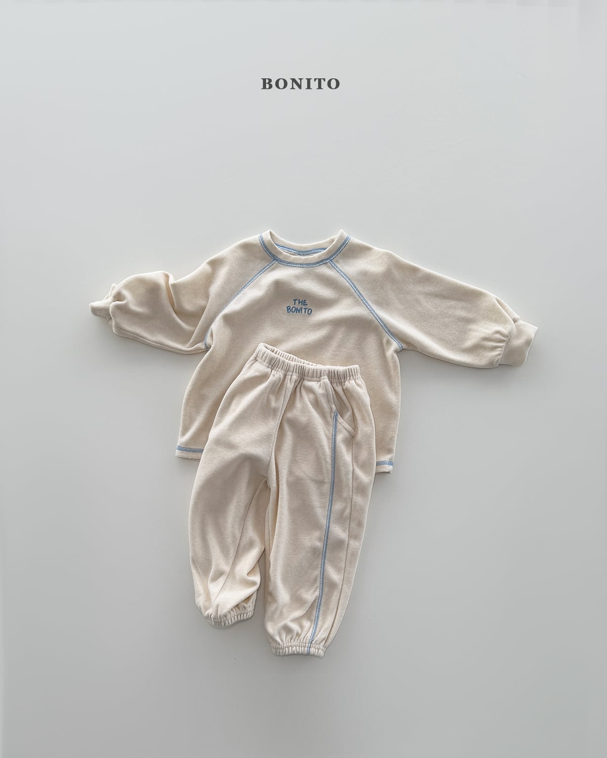 ネックラインや切り替え部分にはガイルッパ縫製ディテールを施し、さりげないアクセントとともにブランドらしい感性をプラス。トップスはゆとりのあるシルエットでリラックス感のある着心地、ボトムスは裾ゴム仕様のジョガーフィットで動きやすく、可愛らしいフォルムを演出します。